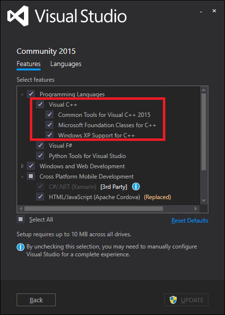 해결책은 VS2015 설치 프로그램 관리자에서 Programming Languages > Virtual C++ 을 설치해줘야 한다.